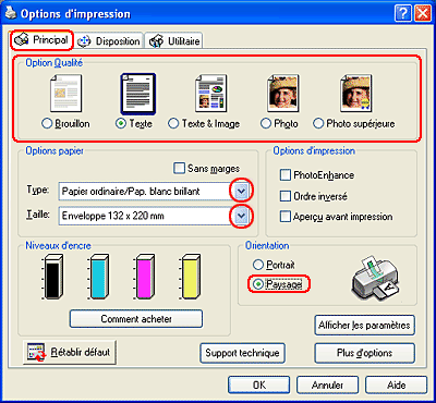Le paramètre Economie proposé dans la zone Options papier & qualité du menu avancé n'est pas disponible pour une impression sur des enveloppes.