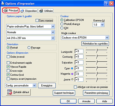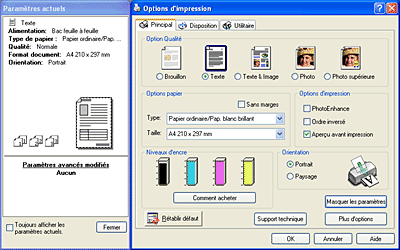 L'onglet Principal permet de régler les paramètres Option Qualité, Options papier, Options d'impression, Orientation et Plus d'options, et aussi de vérifier les niveaux d'encre. Reportez-vous à la section appropriée ci-dessous.