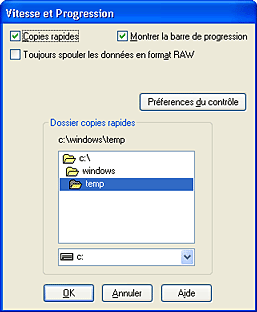 Cette boîte de dialogue vous permet d'effectuer des réglages relatifs à la vitesse et à la progression de l'impression.