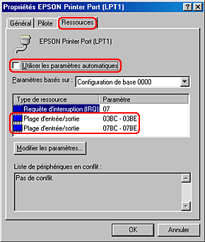![]() | Dans la liste Paramètres basés sur, sélectionnez une configuration de base utilisant la même Plage d'entrée/sortie que celle relevée à l'étape 4, et vérifiez que les valeurs DMA et IRQ sont allouées et affichées Vérifiez également que la zone Liste de périphériques en conflit indique Pas de conflit. |