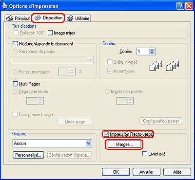 Cliquez sur l'onglet Disposition, puis activez la case à cocher Impression Recto-verso.