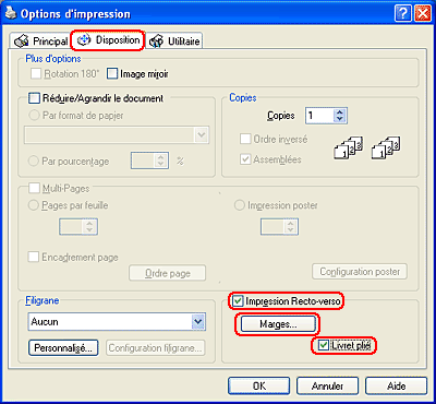 Cliquez sur l'onglet Disposition, puis activez la case à cocher Impression Recto-verso. Activez ensuite la case à cocher Livret plié.