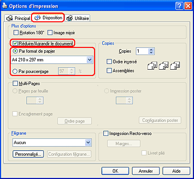 Cliquez sur l'onglet Disposition, puis activez la case à cocher Réduire/Agrandir le document. Vous pouvez sélectionner les options suivantes pour modifier la taille du document.