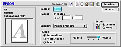| En mode Automatique, selon le support sélectionné dans la liste Support, un curseur s'affiche à droite des options de la zone Mode et vous permet de faire un choix entre la Qualité, la Vitesse, ou un réglage intermédiaire. Choisissez Qualité quand cette caractéristique compte plus que la vitesse. |