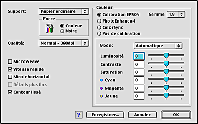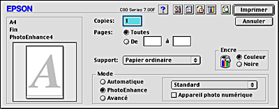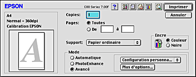 Quand l'option Automatique est sélectionnée dans la zone Mode de la zone de dialogue Imprimer, le logiciel d'impression définit tous les paramètres détaillés en fonction des paramètres courants Support et Encre. Pour définir le paramètre Encre, reportez-vous à la section Définition du paramètre Encre. Pour définir le paramètre Support, reportez-vous à la section Définition du paramètre Support.