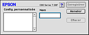 Si vous modifiez les paramètres Support ou Encre lorsque l'une de vos configurations personnalisées est sélectionnée dans la liste Config. personnalisée, la sélection affichée dans la liste revient sur Config. personnalisée. La modification n'a aucune incidence sur la configuration personnalisée précédemment sélectionnée. Pour revenir à votre configuration personnalisée, resélectionnez-la simplement dans la liste.