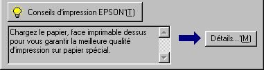 Des conseils pour obtenir les meilleurs résultats de votre logiciel d'impression EPSON s'affichent dans la zone de texte au bas de la fenêtre de la barre de progression. Un nouveau conseil apparaît toutes les 30 secondes. Pour avoir plus de détails sur le conseil affiché, cliquez sur le bouton Détails.