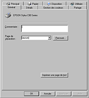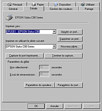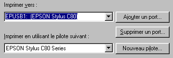 Si la mention EPUSBx : (EPSON Stylus C80 ou EPSON Stylus C70) est affichée dans la zone de liste Imprimer vers, le pilote d'impression USB et le logiciel d'impression sont correctement installés. Si le port adéquat n'est pas affiché, passez à l'étape suivante.