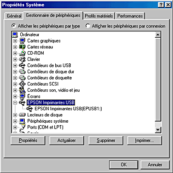 Si les pilotes sont correctement installés, EPSON Imprimantes USB doit apparaître dans l'onglet Gestionnaire de périphériques.