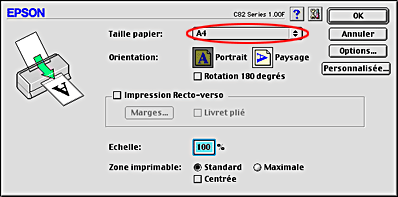 Sélectionnez A4 pour le paramètre Taille papier. Ensuite, cliquez sur OK pour fermer la zone de dialogue.