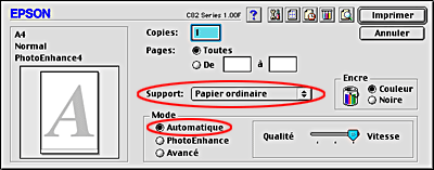 Sélectionnez Papier ordinaire pour le paramètre Support, et Automatique dans la zone Mode.