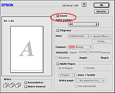 La fonction Zoom permet d'imprimer un document de telle façon qu'il convienne au format de papier sélectionné dans la liste Taille du menu Papier.