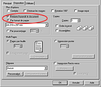 Dans le menu Disposition (Windows), cochez la case Réduire/Agrandir le document et sélectionnez Par format de papier.