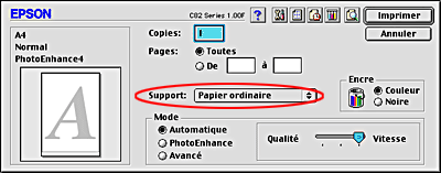 Sur Macintosh, sélectionnez le Support approprié dans la zone de dialogue Imprimer, puis la Taille papier dans la zone de dialogue Format d'impression.