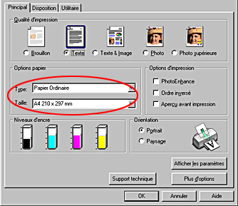 Sous Windows, sélectionnez la Taille et le Type de papier appropriés dans la zone Options papier du menu Principal.