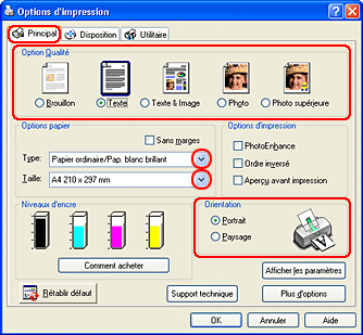 Pour modifier l'orientation du tirage, sélectionnez Portrait (vertical) ou Paysage (horizontal).