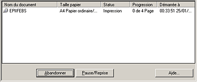 Cliquez sur le nom du document en cours d'impression dans la liste Nom du document, puis cliquez sur le bouton Stop pour annuler l'impression.