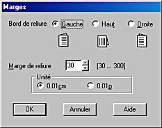 Cliquez sur ce bouton pour ouvrir la boîte de dialogue Marges. Ce paramètre vous permet d'indiquer le bord sur lequel sera placé la reliure. Vous avez le choix entre Gauche, Haut et Droit. Vous pouvez aussi indiquer la largeur de la marge de reliure en saisissant une valeur dans la zone de texte Marge de reliure.