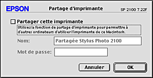 Cochez la case Partager cette imprimante, puis tapez le nom de l'imprimante et le mot de passe si nécessaire.