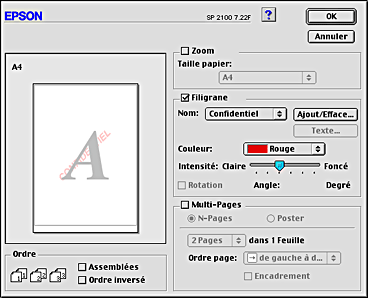 Sélectionnez dans la liste le filigrane que vous voulez imprimer, puis indiquez sa position, sa taille, sa couleur et son intensité. Vous pouvez modifier la position et la taille du filigrane en le faisant glisser avec la souris dans la fenêtre d'aperçu sur la gauche.