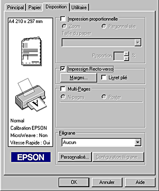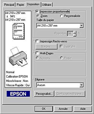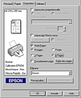 Dans le menu Disposition, vous pouvez définir les paramètres Impression proportionnelle, Multi-Pages et Filigrane. Reportez-vous à la section appropriée ci-après.