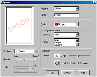 Vérifiez que le filigrane voulu est sélectionné dans la zone de liste Filigrane, puis réglez les paramètres Couleur, Position, Densité, Taille, Police, Style de police et Angle (pour plus de détails, consultez l'aide en ligne). Le résultat de vos réglages est visible dans l'aperçu du filigrane, sur le côté gauche de la boîte de dialogue.