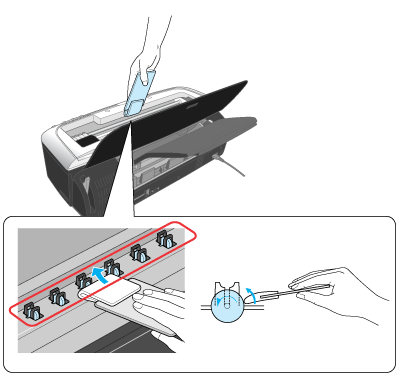 Nettoyez les rouleaux de l'imprimante avec le tampon de nettoyage humide. Faites tourner les rouleaux de l'imprimante pour vérifier qu'ils sont parfaitement propres.