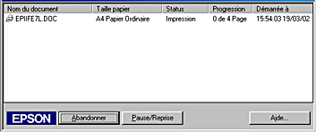 L'utilitaire EPSON Spool Manager est similaire au Gestionnaire d'impression de Windows. S'il reçoit deux ou plusieurs travaux à la fois, il les conserve dans l'ordre de leur arrivée (pour des imprimantes en réseau, on appelle cela une file d'attente d'impression). Quand un travail atteint le début de la file d'attente, l'utilitaire EPSON Spool Manager lance l'impression de ce travail. Vous pouvez annuler des travaux d'impression à partir de Spool Manager. Vous pouvez aussi afficher des informations d'état relatives aux travaux d'impression qui ont été envoyés à l'imprimante, ainsi que suspendre, reprendre ou redémarrer des travaux d'impression sélectionnés.