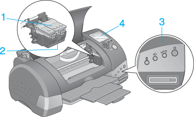 3. Panneau de contrôle, partie avant : contrôle différentes fonctions de l'imprimante. Pour plus de détails, reportez-vous à la section suivante.