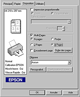 Dans le menu Disposition, vous pouvez définir les paramètres Impression proportionnelle, Multi-Pages et Filigrane. Reportez-vous à la section appropriée ci-après.