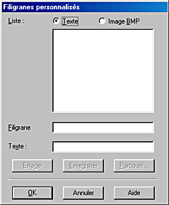 Vous pouvez aussi ajouter vos propres filigranes à base de texte ou d'image à la liste Filigrane. Pour ajouter un filigrane, cliquez sur le bouton Personnalisé. La boîte de dialogue suivante s'ouvre.