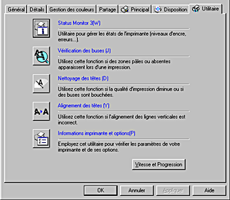 Pour vous servir des utilitaires, cliquez sur l'onglet Utilitaire dans la fenêtre du logiciel d'impression, et cliquez sur le bouton de l'utilitaire choisi. Pour ouvrir le logiciel d'impression, reportez-vous à la section ci-dessous :