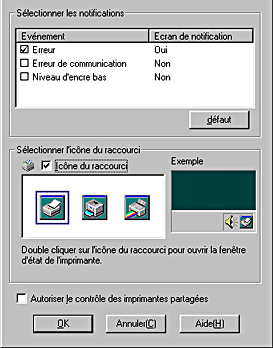 Cliquez sur ce bouton pour ouvrir la boîte de dialogue Préférences du contrôle, dans laquelle vous pouvez définir les paramètres de l'utilitaire EPSON Status Monitor 3.