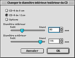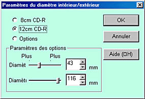 Cliquez sur Changer le diamètre intérieur/extérieur du CD dans le menu Fichier. La zone de dialogue Changer le diamètre intérieur/extérieur du CD s'ouvre.