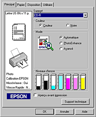 Pour l'impression sur CD-R, on utilise un plus faible niveau de saturation de couleur qu'avec du papier spécial EPSON afin de garantir la qualité d'impression.