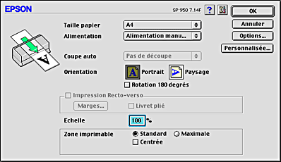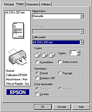 Sélectionnez Manuelle dans la zone de liste Alimentation, A4 dans la zone de liste Taille papier et Portrait dans la zone Orientation.