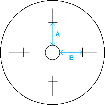 Si vous imprimez le motif de contrôle de la position d'impression sur le CD-R et non sur la feuille de contrôle, l'écart ne pourra pas être mesuré correctement. Veillez à inclure le compartiment transparent interne du CD-R dans la plage de mesure. Mesurez la distance de la circonférence du cercle central du plateau du CD-R à la ligne horizontale du motif de contrôle.