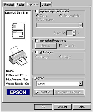 Dans le menu Disposition, vous pouvez définir les paramètres Impression proportionnelle, Impression recto-verso, Multi-Pages et Filigrane. Reportez-vous à la section appropriée ci-après.