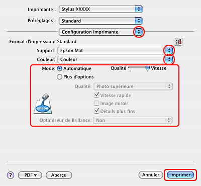 Sélectionnez les paramètres Support, Couleur et Mode adaptés. Pour plus de détails sur l’option Configuration Imprimante, reportez-vous à l’aide en ligne.