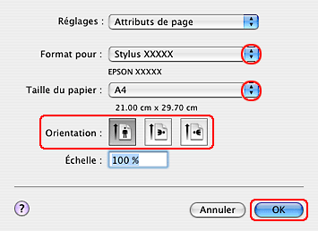 Sélectionnez les paramètres Taille papier et Orientation adaptés. Vous pouvez aussi définir une taille de papier personnalisée. Pour plus de détails, reportez-vous à l’aide en ligne.