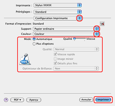 Sélectionnez les paramètres Support, Couleur et Mode adaptés. Pour plus de détails sur l’option Configuration Imprimante, reportez-vous à l’aide en ligne.