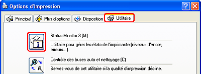 Lorsque le niveau d'encre d'une cartouche est faible, Rappel niveau d'encre faible s'affiche automatiquement. Cet écran vous permet également de connaître l'état de la cartouche d’encre. Si vous ne souhaitez pas afficher cet écran, accédez au pilote d'impression, cliquez sur l'onglet Utilitaire, sur Vitesse et Progression, puis sur Préferences du contrôle. Au niveau de l'écran Préferences du contrôle, désactivez la case à cocher Activer Rappel niveau d'encre faible.