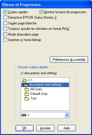 Vous pouvez augmenter la vitesse d'impression en sélectionnant certains paramètres de la fenêtre Vitesse et Progression. Cliquez sur le bouton Vitesse et Progression de la fenêtre Utilitaire du pilote d'impression.