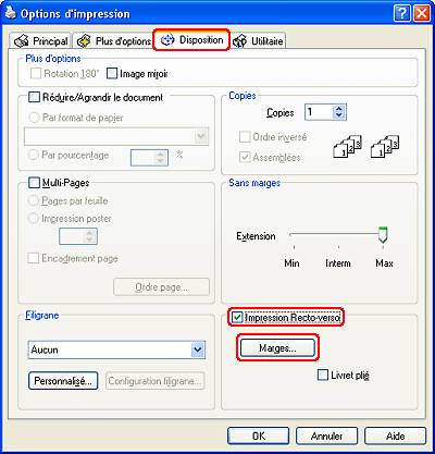Cliquez sur l’onglet Disposition, puis activez la case à cocher Impression Recto-verso.