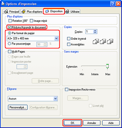 Cette fonction n’est pas disponible dans le cadre de l'impression sans marges.