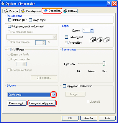 Cette fonction n’est pas disponible dans le cadre de l'impression sans marges.