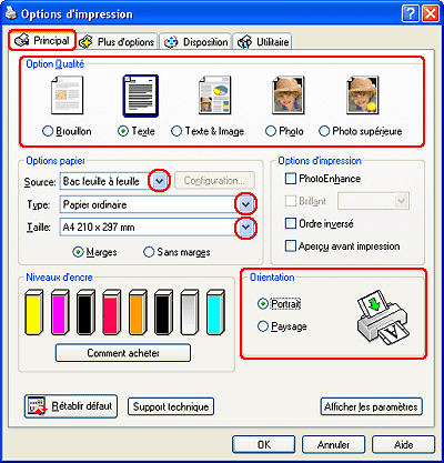 Pour modifier l'orientation de l'impression, sélectionnez Portrait (vertical) ou Paysage (horizontal).
