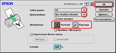 Réglez le paramètre Pour. Pour imprimer avec des marges standard, sélectionnez Stylus Photo R200.