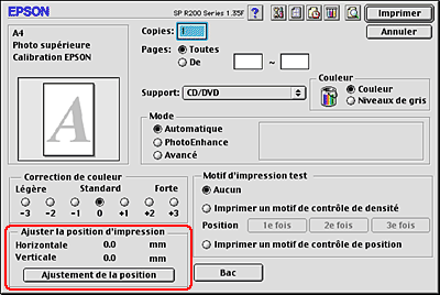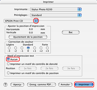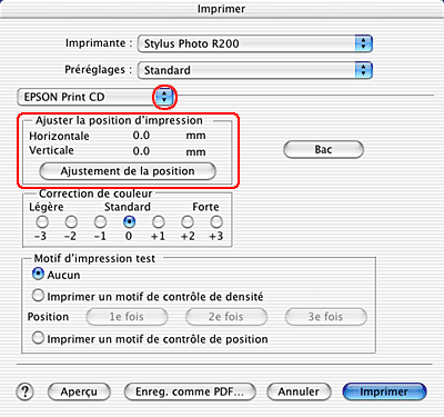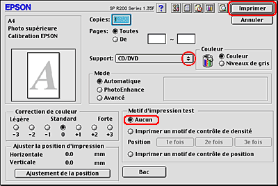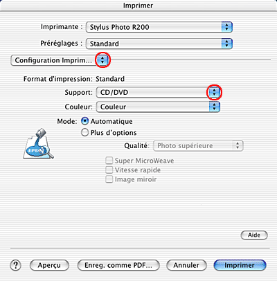 Sélectionnez Stylus Photo R200 pour le paramètre Imprimante. Sélectionnez sur Configuration imprimante dans le menu déroulant. Sélectionnez CD/DVD pour le paramètre Support.