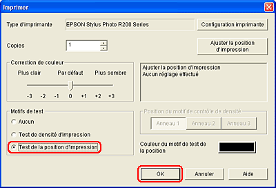 Dans la zone Motifs de test, activez la case à cocher Test de la position d'impression et cliquez sur OK.